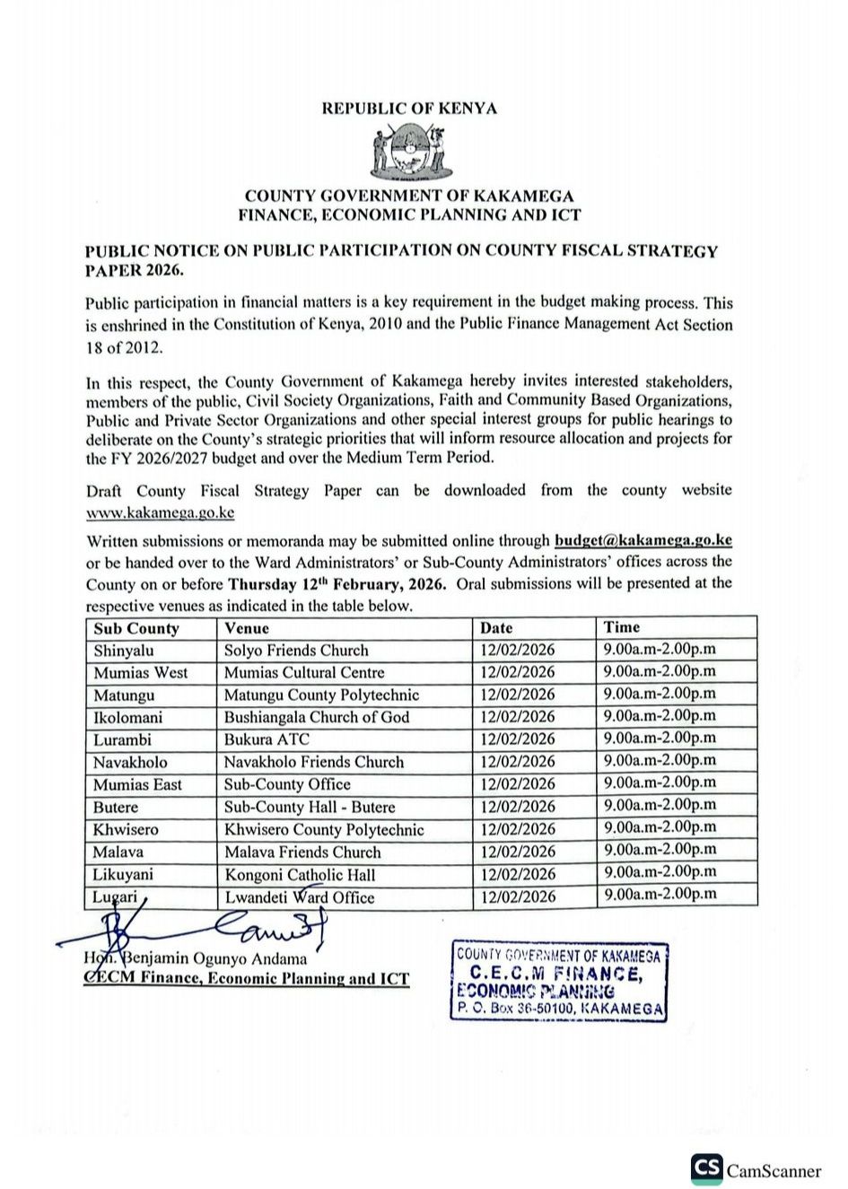 FeaturedNewsTrending PUBLIC NOTICE – PARTICIPATION ON COUNTY FISCAL STRATEGY PAPER 2026 January 27, 2026 George Manyasa